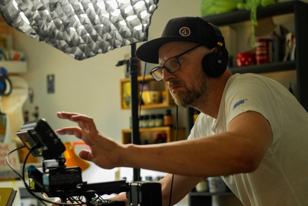 Olaf Markmann filming for “I Just Keep Going” in Birgit Weyhe’s studio.