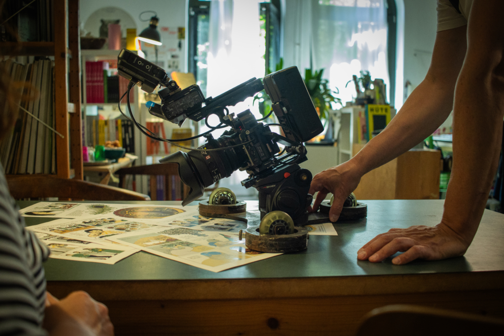 Birgit, the comic artist, who is talking to her, understands what she’s saying. And in post-production, I got the transcript from the interview, and most of the things I first heard then, or I read then, because I couldn’t hear it on the day, except for some key points. Leyla’s always translating the main issues, but not everything word to word. And on the other hand, because I’m the filmmaker, I have to take care of the cameras, of the lights, of the sound, of the surrounding, of any noises, basically of everything.